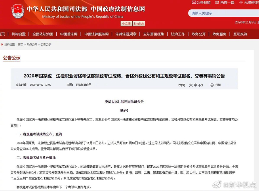 記者9日從司法部獲悉,2020年國家統一法律職業資格考試客觀題考試成績將于11月10日公布,全國合格分數線為180分。自11月10日0時起,應試人員可通過司法部網站、司法部微信公眾號和中國普法網、中國普法微信公眾號查詢成績,登錄司法部網站自行下載打印成績通知單。通過2020年客觀題考試的應試人員和2019年客觀題考試保留有效成績人員,應于11月10日0時至11月14日24時,登錄司法部網站報名確認參加主觀題考試。(記者白陽)