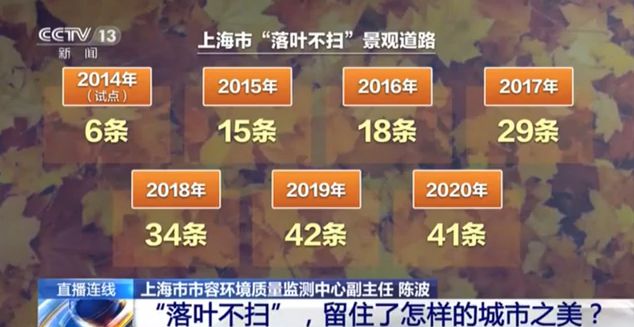 陳波:上海是一個人文之城,是一個海納百川的城市,我們希望這些景致能有一些代表性。但也不是每一條道路都適合開展“落葉不掃”,因為里面還有考慮到交通通行情況,包括有些路段可能在一段時間會有一些施工等等,肯定不適宜開展“落葉不掃”。