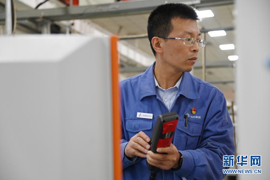 11月26日,在河南平原光電有限公司車間,梁兵通過搖手輪進行刀具補償的測量。新華社記者 張浩然 攝
