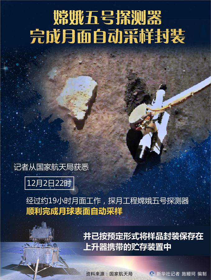 新華社北京12月3日電(記者胡喆)記者3日從國家航天局獲悉,12月2日22時,經(jīng)過約19小時月面工作,探月工程嫦娥五號探測器順利完成月球表面自動采樣,并已按預(yù)定形式將樣品封裝保存在上升器攜帶的貯存裝置中。