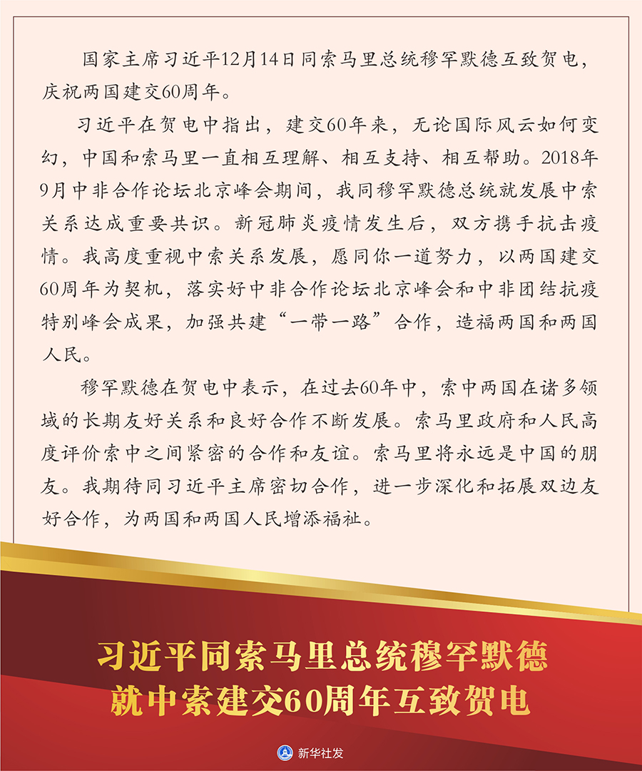 新華社北京12月14日電 國家主席習近平12月14日同索馬里總統穆罕默德互致賀電,慶祝兩國建交60周年。