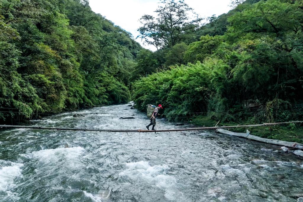 界务员在前往中缅39号界桩途中经过一座独木桥。新华社发 褚建伟摄