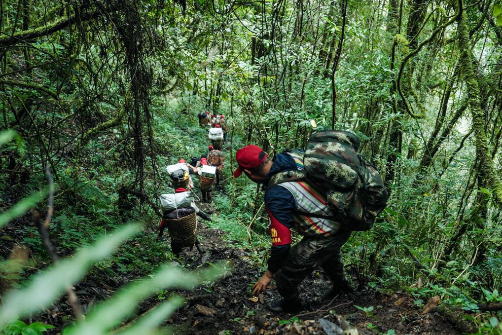 界务员们背着大包徒步前往中缅39号界桩。新华社发 褚建伟摄