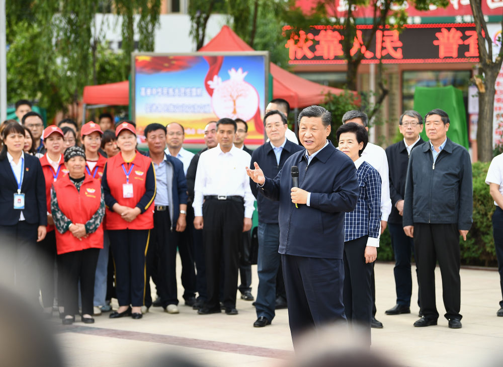 (2020年6月8日下午,習(xí)近平在吳忠市利通區(qū)金花園社區(qū)廣場(chǎng),同居民們親切交流。新華社記者燕雁攝)