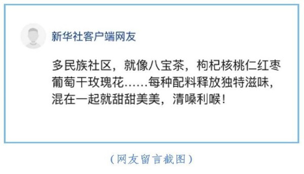 還有網(wǎng)友以寧夏著名的八寶茶來形容各民族團(tuán)結(jié)和諧的景象——各種配料搭在一起,才能有滋有味。缺哪一樣,都少點(diǎn)“茶味”。