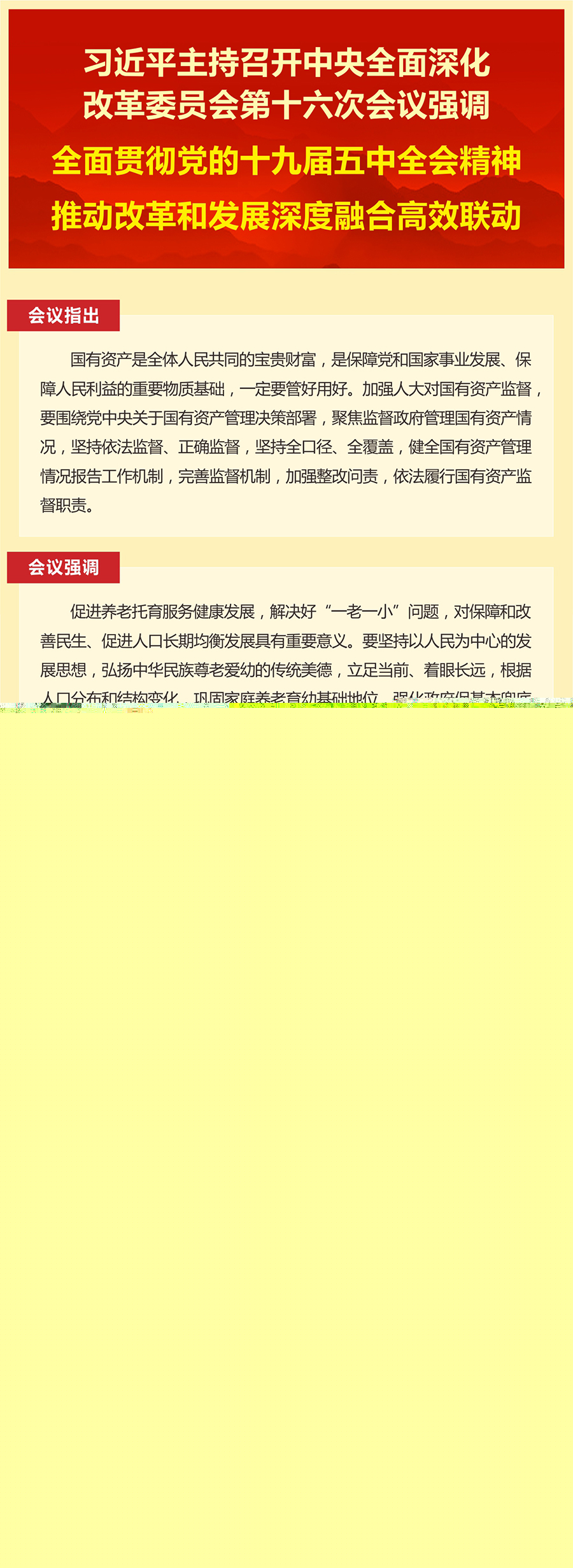 會議強調,改革推進到今天,在改革頂層設計方面,我們已經有了比較清晰的大盤子。今后一個時期,要將主要精力集中到整體推進、督促落實上,以落實“十四五”時期重大發展戰略任務為牽引,多策劃戰略戰役性改革,抓綱帶目。對黨的十九屆五中全會部署的構建新發展格局、完善要素市場化配置、完善公平競爭制度、創新鏈產業鏈融合發展、激發市場主體活力、穩定保障就業、完善收入分配制度、促進經濟社會發展全面綠色轉型、建設開放型經濟新體制等,都要抓在手上、抓出成效。各地區各部門要強化改革創新的政治自覺和行動自覺,落實好主體責任。