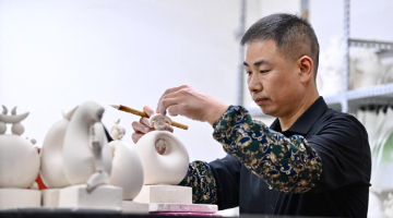 12月9日,西洛在合作社展览厅查看和同事们一起制作的西藏传统面具。