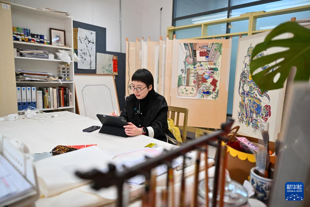 2月4日,在天津杨柳青画社,天津杨柳青画社第四代彩绘传承人王艳绘制马年年画底稿。