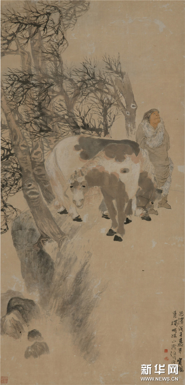任伯年 寒林放马 纸本水墨设色 129.4cm×62.4cm 1888 中国美术馆藏