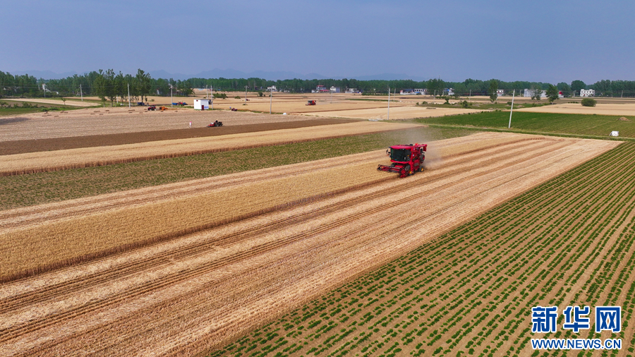 5月19日,在河南省南阳市社旗县郝寨镇石桥村,收割机在收获小麦。新华网发(张举 摄)