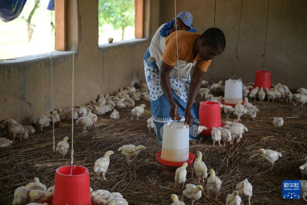 1月26日,在津巴布韦中马绍纳兰省沙姆瓦地区津迪村,一名村民在中国援助建设的养鸡场里检查喂食器。新华社记者 杨光 摄