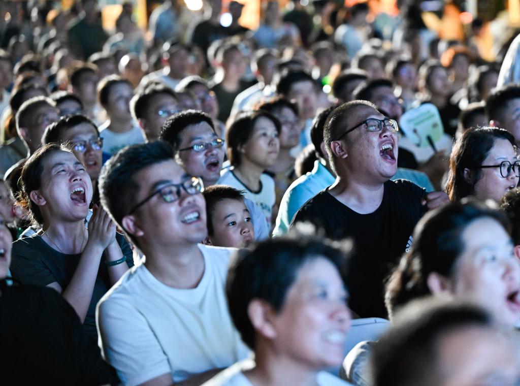 10月4日,球迷在南京市建邺区银杏里文化艺术街区的“苏超”“第二现场”观赛。新华社记者 李博 摄