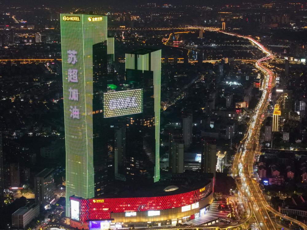 在南京市建邺区一处高层建筑利用灯光效果打出“苏超加油”字样(7月4日摄,无人机照片)。新华社记者 李博 摄