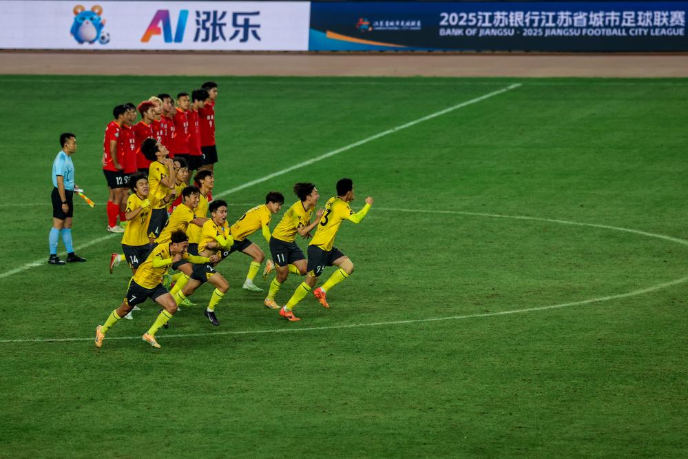 11月1日,泰州队球员夺冠后庆祝。当日,在江苏南京举行的2025江苏省城市足球联赛(“苏超”)决赛中,南通队与泰州队在常规时间0比0战平,通过点球大战,泰州队总比分4比3战胜南通队,夺得冠军。新华社记者 李博 摄
