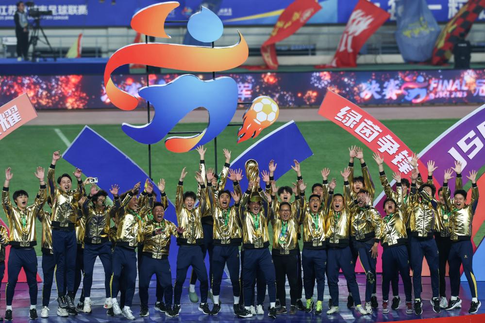 11月1日,冠军泰州队在颁奖仪式上庆祝。当日,在江苏南京举行的2025江苏省城市足球联赛(“苏超”)决赛中,南通队与泰州队在常规时间0比0战平,通过点球大战,泰州队总比分4比3战胜南通队,夺得冠军。新华社记者 李博 摄