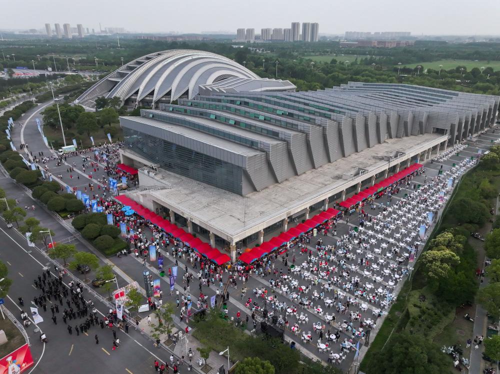 6月14日,江苏省淮安市以“激情夏日 乐享足球”为主题,在江苏省城市足球联赛第四轮淮安队对阵南京队比赛期间,在淮安奥体中心周边打造集美食体验、购物休闲、娱乐互动、文化传播为一体的淮安主场比赛配套市集,营造热烈的赛事氛围,提升赛事附加值。这是6月14日拍摄的江苏淮安“苏超”市集(无人机照片)。新华社记者 李博 摄