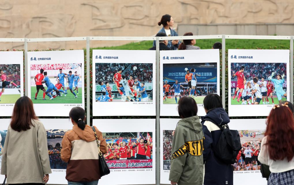 11月1日,观众在南京奥体中心东门广场参观“苏超”摄影作品展。随着“苏超”决赛的到来,“苏超”摄影作品展在南京启幕,展览分别在南京奥体中心东门广场和江苏省现代美术馆1号厅两地展出。新华社发