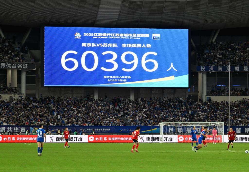 7月5日,球场大屏显示本场比赛共有60396名观众到场观看“苏超”第六轮南京队对阵苏州队的比赛。新华社记者 季春鹏 摄