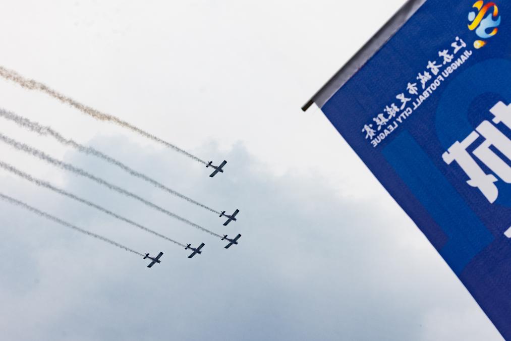 6月14日,飞行编队飞过“苏超”赛场上空。当日,在江苏扬州举行的2025江苏省城市足球联赛第四轮比赛中,扬州队主场1比1战平泰州队。新华社发(张卓君摄)