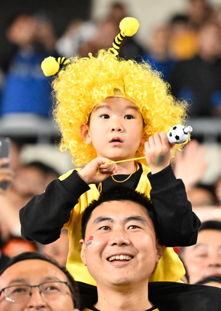 11月1日,一名球迷在“苏超”决赛现场为双方球队加油。新华社记者 李博 摄