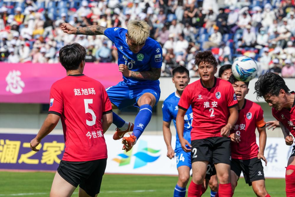6月14日,南京队球员滕帅(左二)在比赛中头球破门。当日,在江苏省淮安市举行的2025江苏省城市足球联赛第四轮比赛中,淮安队主场1比1战平南京队。新华社记者 李博 摄