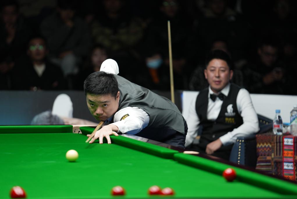 伍金多吉与丁俊晖(左)在比赛中(资料图)。新华社记者 晋美多吉 摄