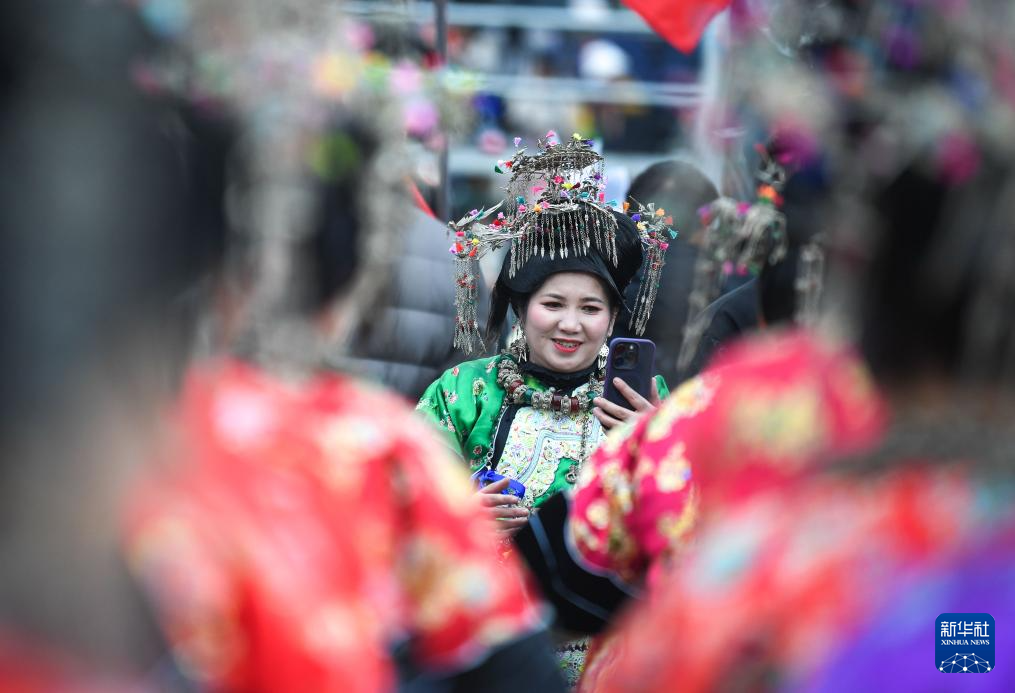 1月2日,侗族群众在第四届贵州“村超”开幕式现场整理头饰。