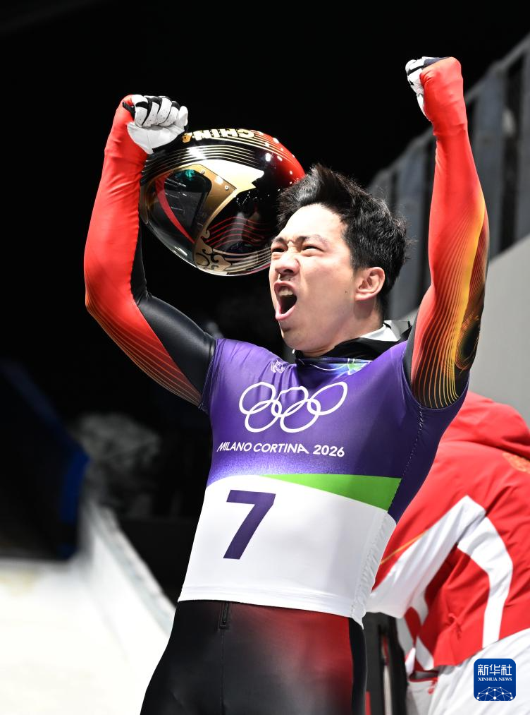 2月13日,中国选手陈文浩(前)在第四轮比赛后与队友拥抱庆祝。他获得第四名。
