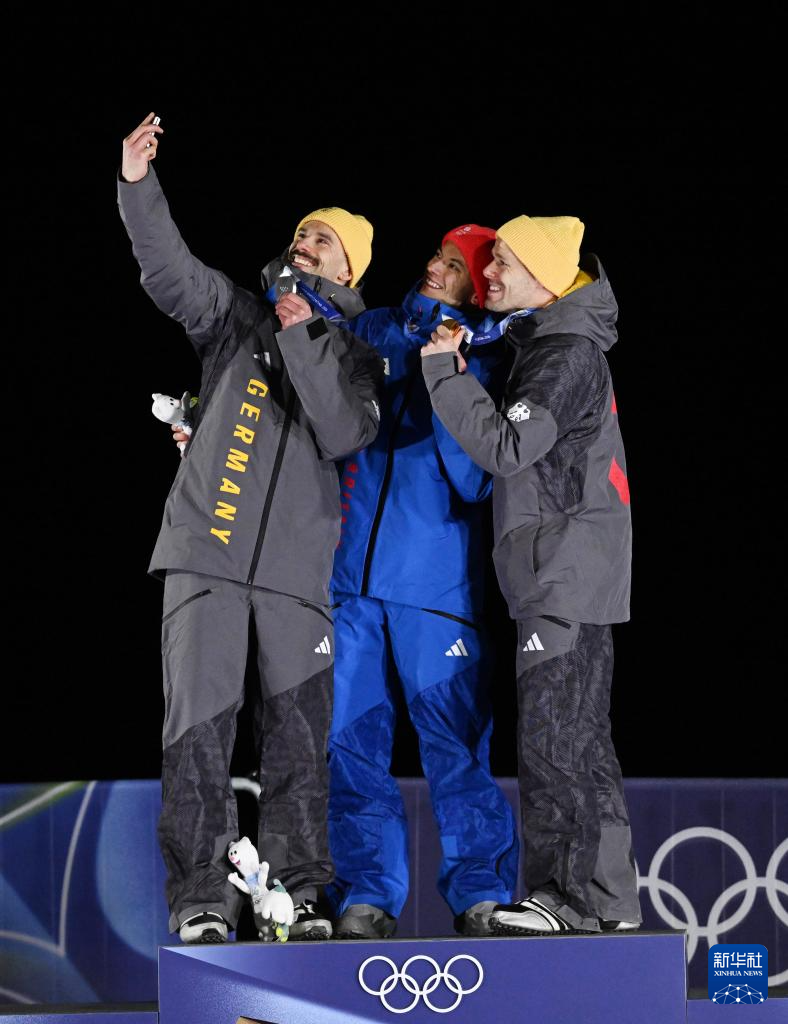 2月13日,冠军英国选手韦斯顿(中)、亚军德国选手容克(左)和季军德国选手格罗特赫尔在颁奖仪式上自拍。