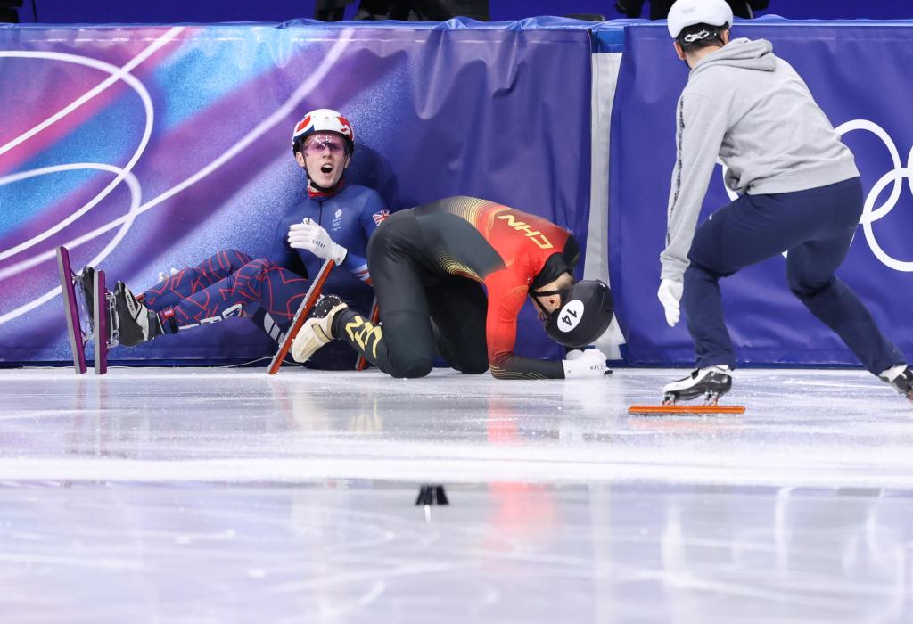 2月14日,中国选手刘少昂(中)在比赛中被摔倒的英国选手特雷西(左)带出赛道。新华社记者 陈益宸 摄