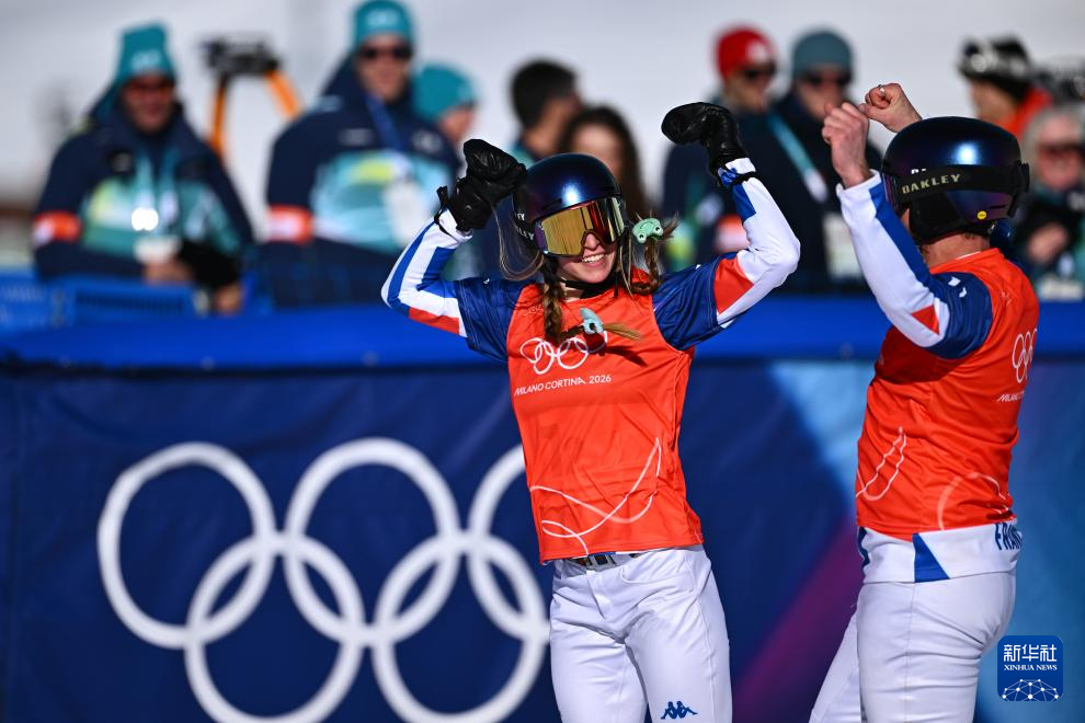 2月15日,法国2队选手莱娅·卡斯塔 (左)与搭档洛昂·博佐洛庆祝。他们获得季军。