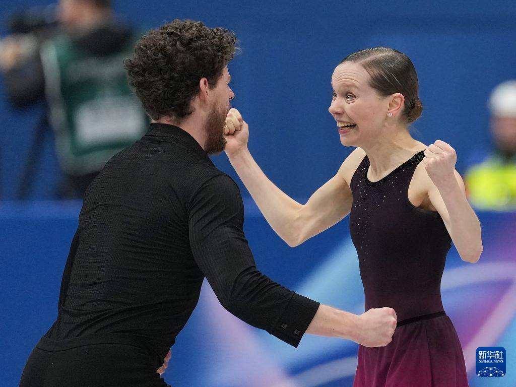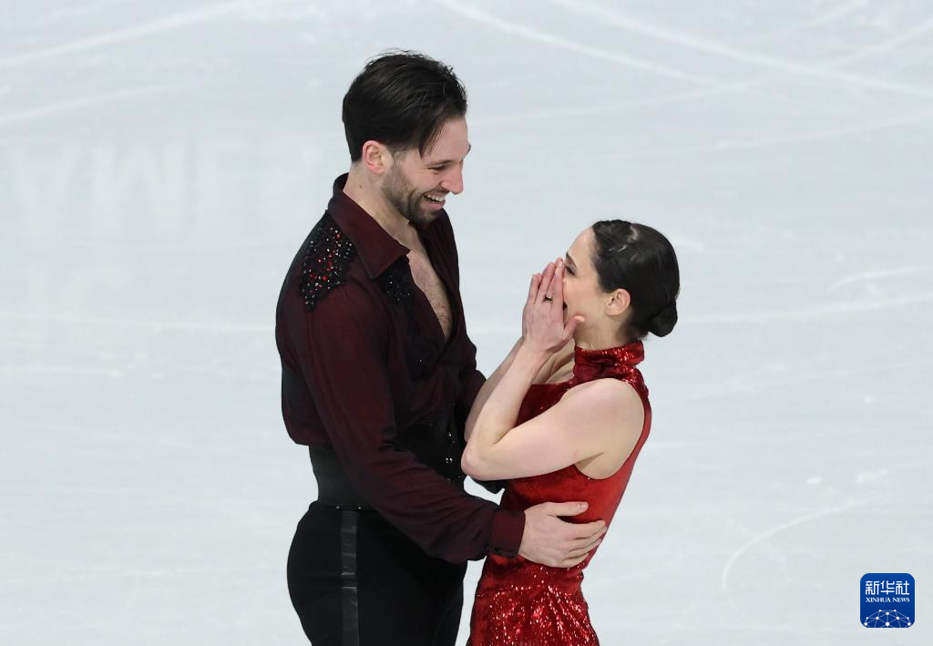 2月16日,加拿大组合斯特拉托-杜德克/德尚(右)在比赛后。