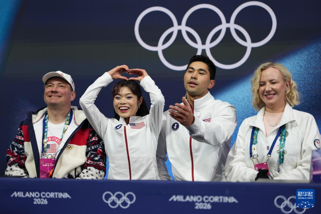2月16日,美国组合埃米莉·陈(左二)/豪(右二)在比赛后等待成绩。