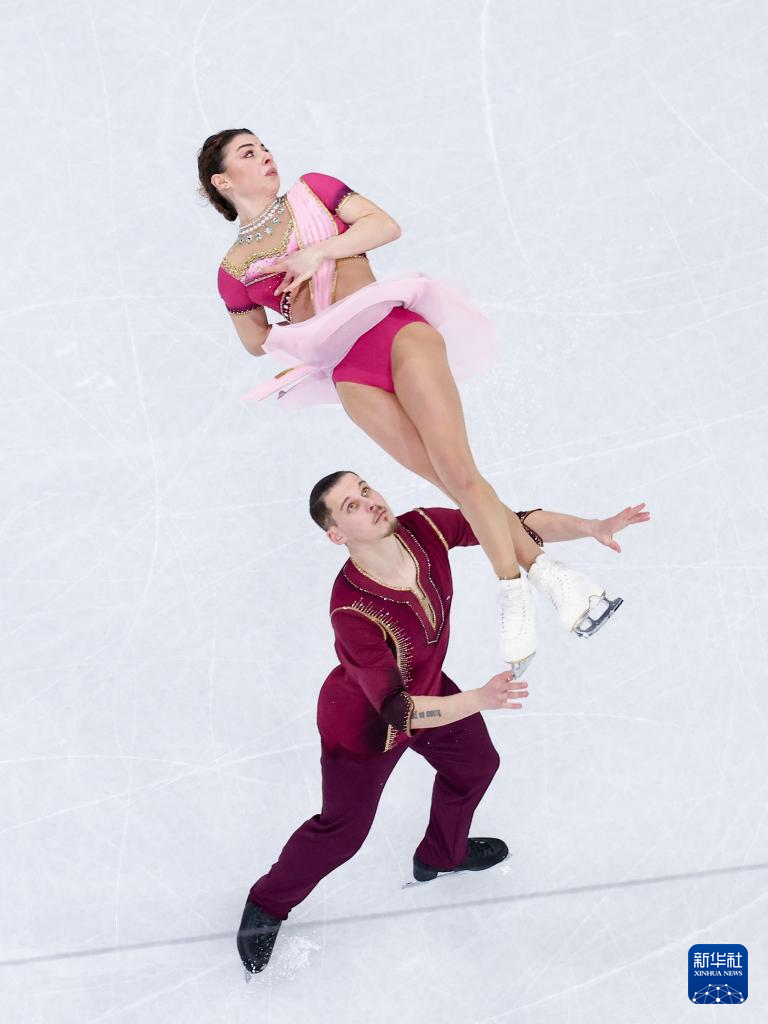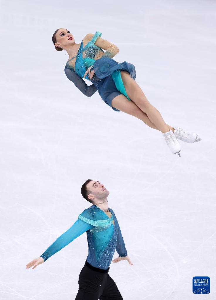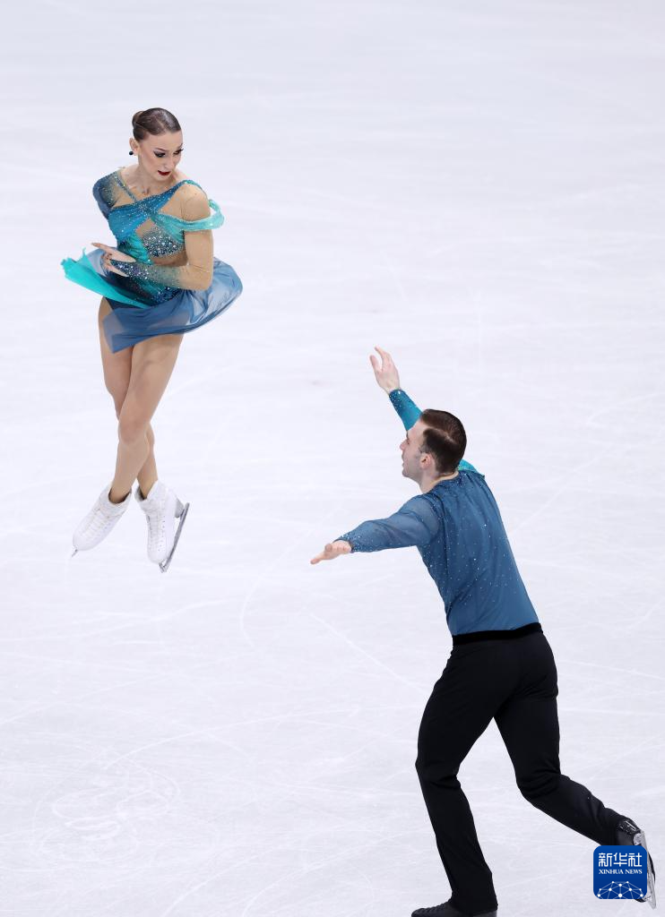 2月16日,格鲁吉亚组合梅特尔基娜/别鲁拉瓦(左)在比赛中。他们获得双人滑项目亚军。