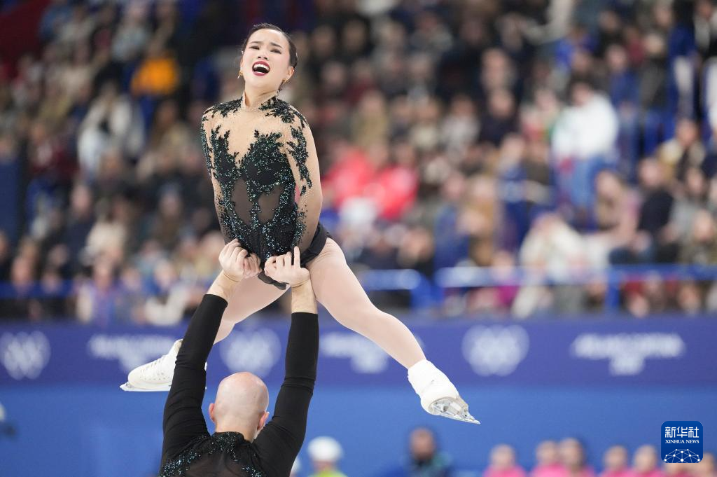 2月16日,美国组合埃莉·甘/奥谢(下)在比赛中。他们获得双人滑项目第九名。