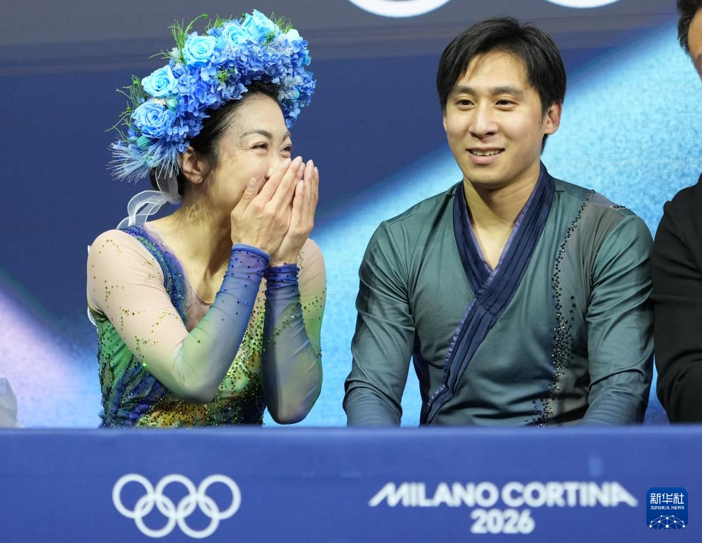 2月16日,日本组合三浦璃来(右)/木原龙一在得知他们的双人滑自由滑成绩后激动不已。最终他们获得双人滑项目冠军。