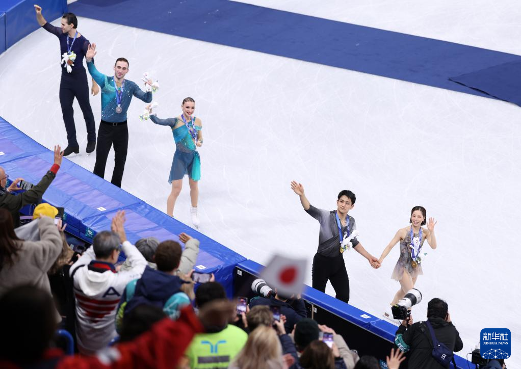 2月16日,冠军日本组合三浦璃来(右一)/木原龙一(右二)与亚军格鲁吉亚组合梅特尔基娜(右三)/别鲁拉瓦(右四)在双人滑颁奖仪式后向观众致意。