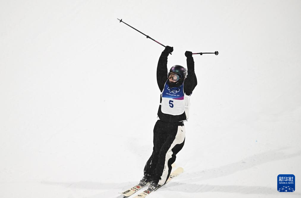 2月16日,中国选手谷爱凌在第三跳后庆祝。