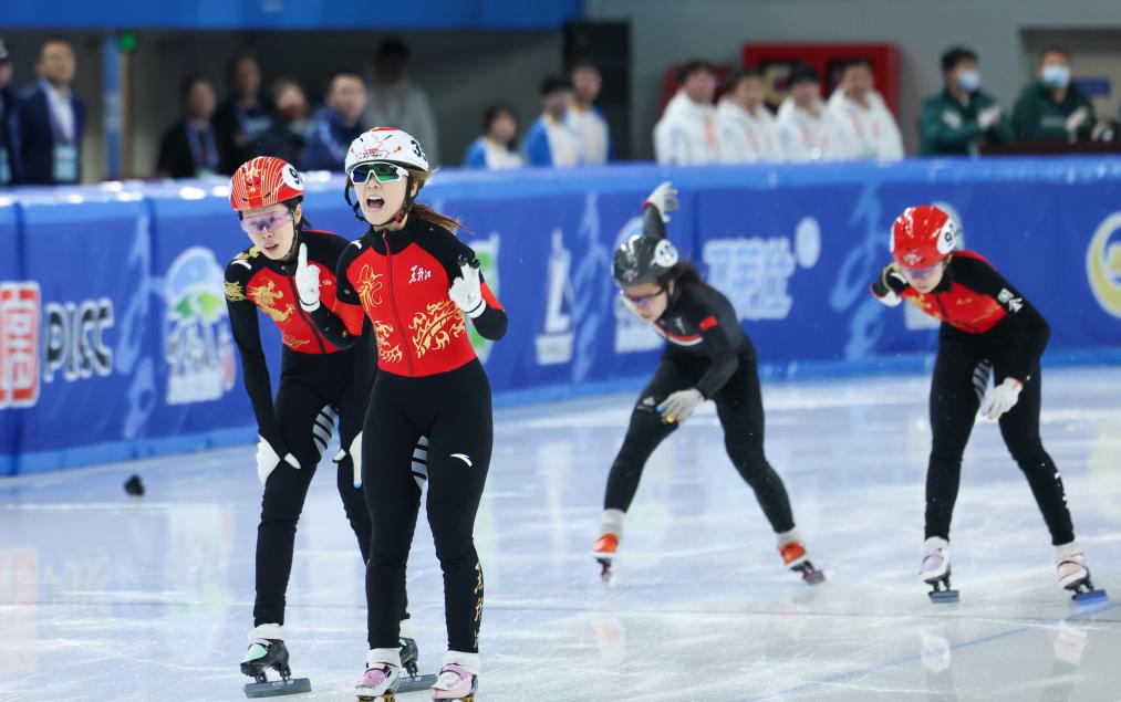 2024年1月14日,杨婧茹(左二)在第十四届全国冬季运动会短道速滑青年组女子1000米A组决赛夺冠后。新华社记者 王楷焱 摄