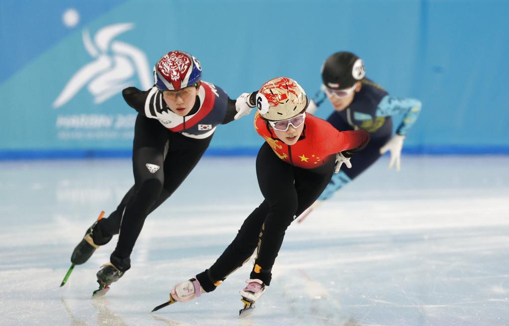 2025年2月7日,中国选手杨婧茹(中)在第九届亚冬会短道速滑女子1500米四分之一决赛中。新华社记者 许雅楠 摄