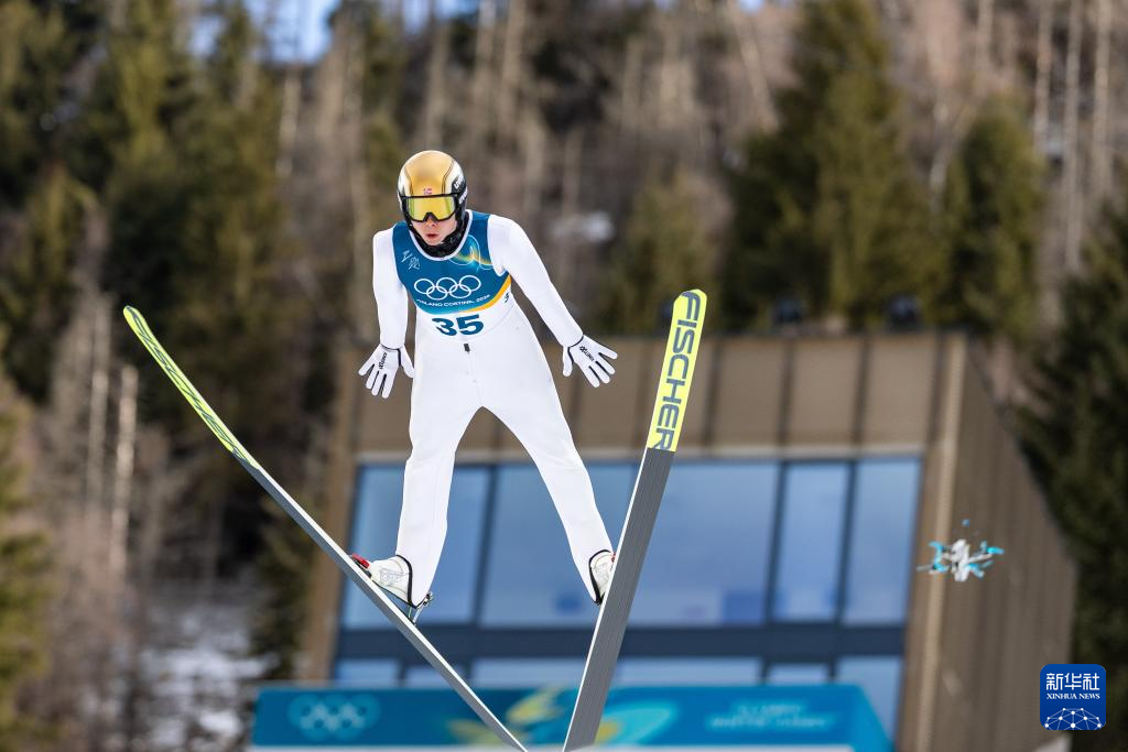 2月17日,挪威选手奥夫特布罗在个人大跳台比赛轮中。