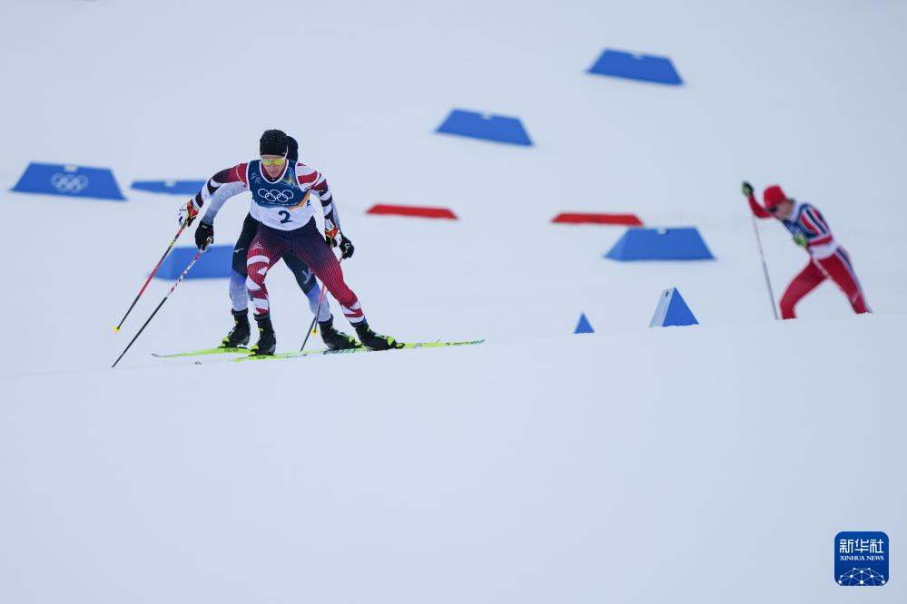 2月17日,挪威选手奥夫特布罗(左一)、奥地利选手兰帕特尔(左二)和芬兰选手海罗拉(右二)在10公里越野滑雪比赛中。