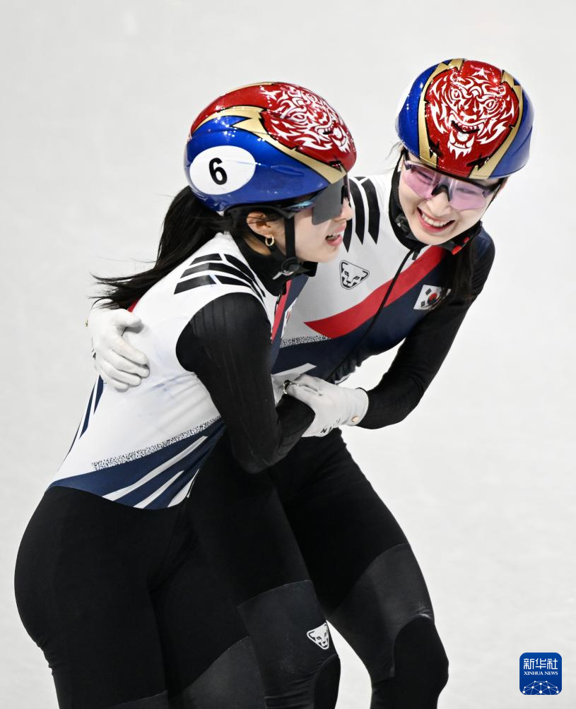 2月18日,韩国队选手金吉莉(左)在比赛中率先冲线后庆祝。