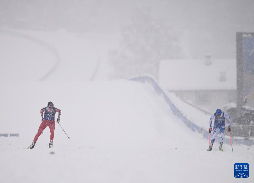 2月19日,挪威队选手奥夫特布罗(左)与芬兰选手希尔沃宁在比赛中即将冲线。