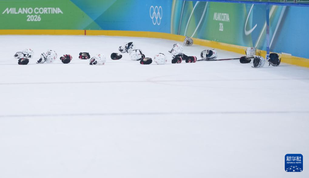这是2月19日拍摄的瑞士队庆祝胜利扔向冰面的头盔和球杆。
