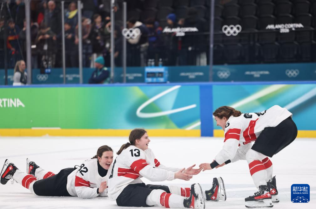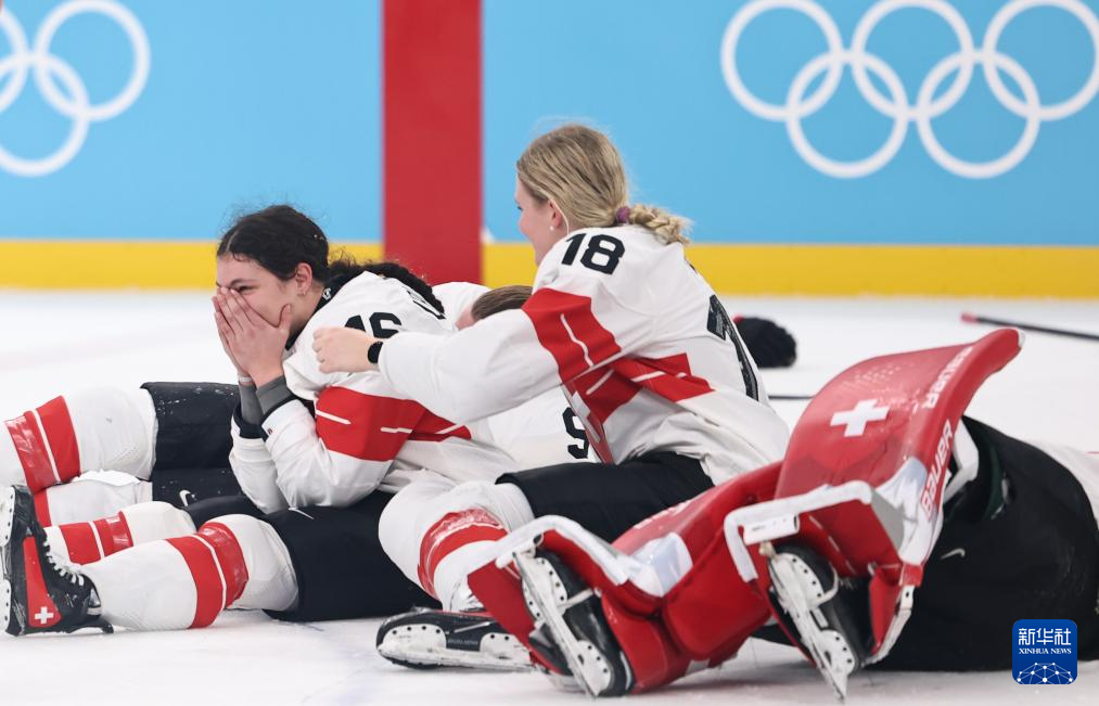 2月19日,瑞士队球员拉拉·斯塔尔德在赛后躺在冰面上庆祝胜利。