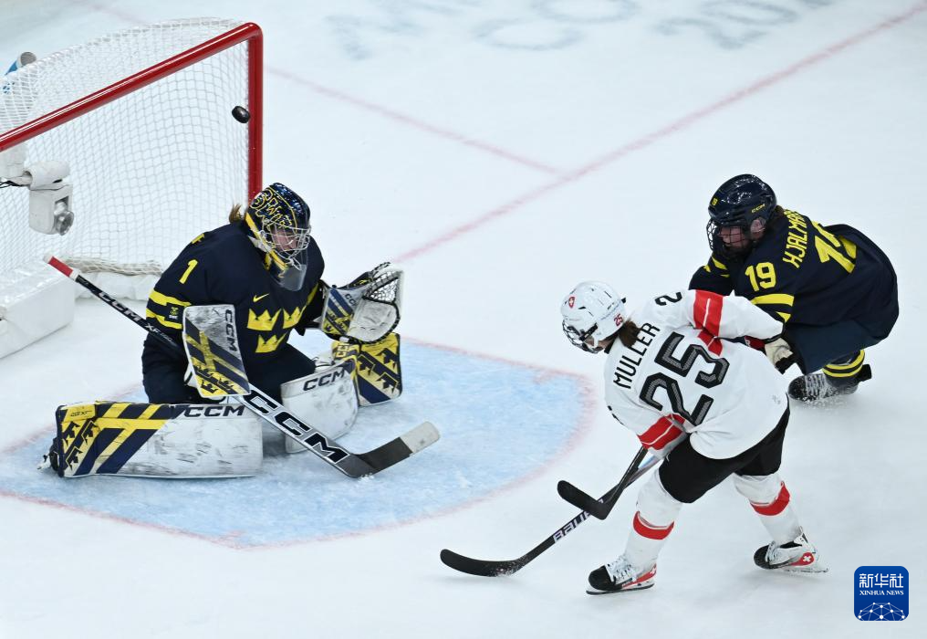 2月19日,瑞士队球员阿林娜·米勒(右二)在加时赛中攻入制胜球。