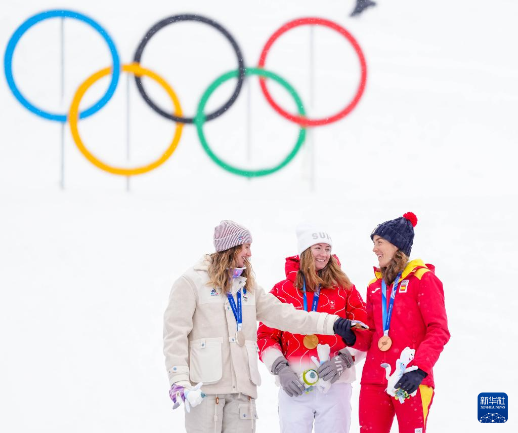 2月19日,冠军瑞士选手法东(中)、亚军法国选手哈罗普(左)和季军西班牙选手阿隆索·罗德里格斯在颁奖仪式上合影。