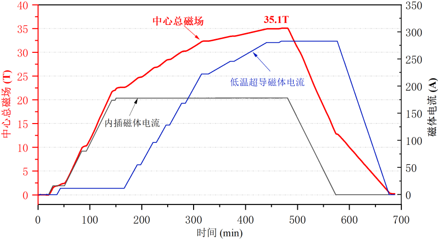 在9月26日夜至27日凌晨的实验中,该超导磁体在35.10万高斯稳定运行30分钟,并安全退磁,充分验证了技术方案的可靠性。