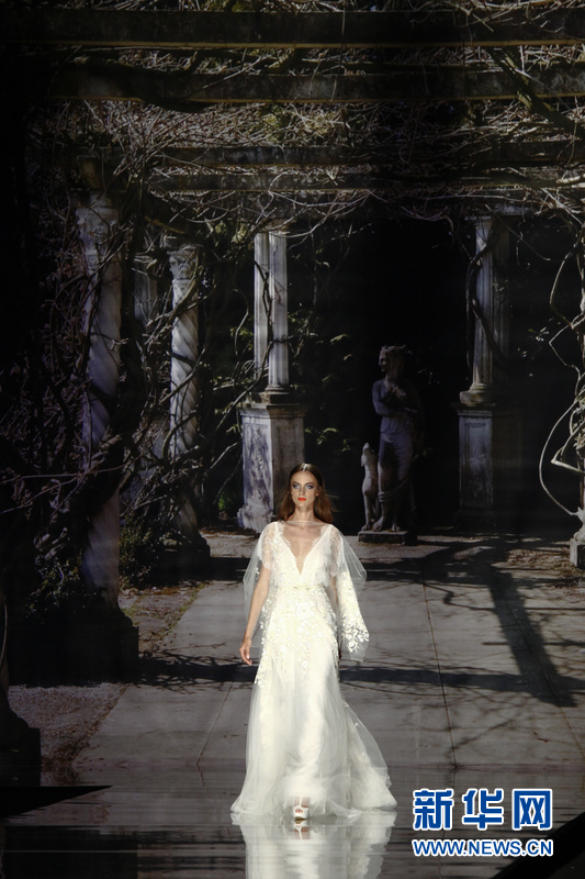 模特在T臺上展示西班牙品牌Yolan Cris的婚紗。Yolan Cris品牌由Yolanda和Cristina姐妹聯手打造,同時這也是來自巴塞羅那當地的一個婚紗品牌。